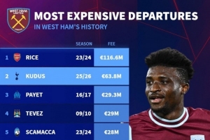 6380万欧!库杜斯是西汉姆出售第二贵球员,最贵是1.166亿欧赖斯